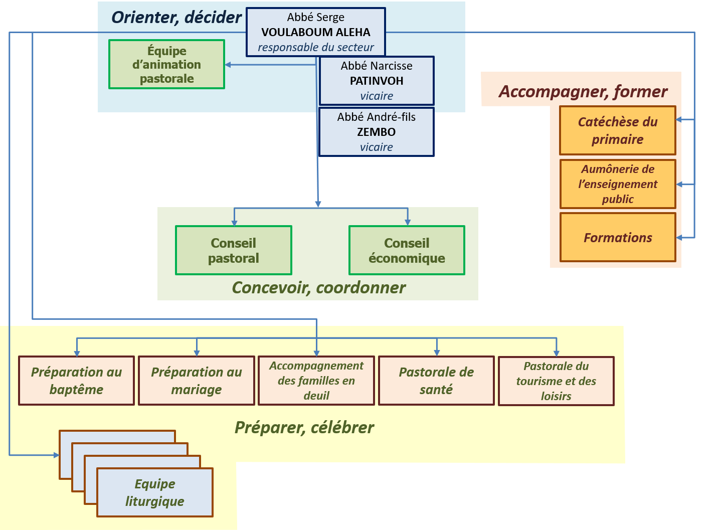 Pour assister le prêtre en charge de la paroisse dans sa mission pastorale et sacerdotale, les laïcs sont organisés en structures de coordination et en pôles d'action.